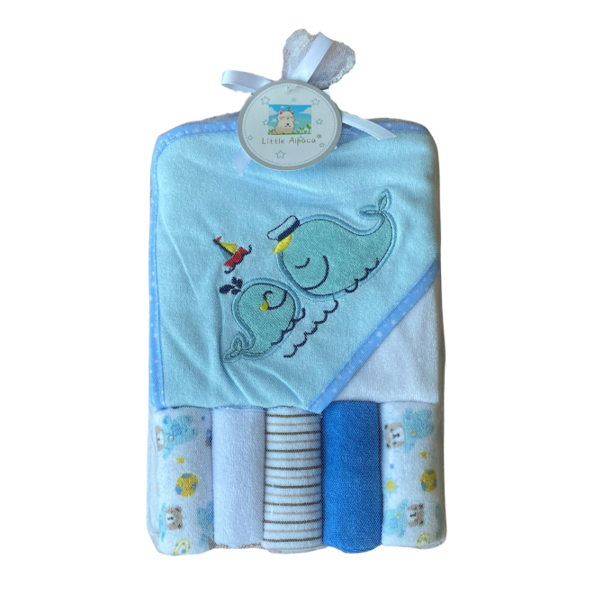 Praktičan i nježan set ručnika za bebe 6/1 savršen je za svakodnevnu upotrebu. Uključuje mekani ručnik s kapuljačom i pet manjih ručnika za umivanje. Funkcionalan i sladak poklon za novorođenče ili baby shower